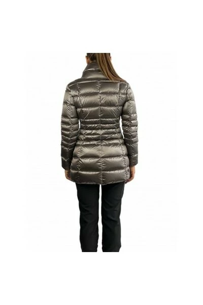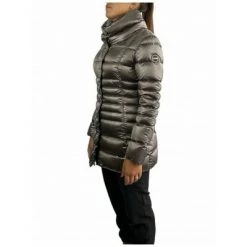 Gemiddelde damesjas gemaakt van gerecycled waterafstotende stof, gemengd met een zwart getint garen in donkere tinten, wat een helder iriserend effect creëert. Natuurlijke veervulling. L ; Laterale opening, de omhullende nek en het spel van de meest dichte quilts op het levenspunt, ze onderstrepen de vrouwelijke kant van dit kledingstuk. Ideaal om het koude winterseizoen onder ogen te zien. Zip sluiting van zijzakken met vulling met hoge nek in natuurlijke veervulling in tegenstelling tot gerecyclede stofwater Weerwerende behandeling Colmar Originals aangebracht op de linkerkleef