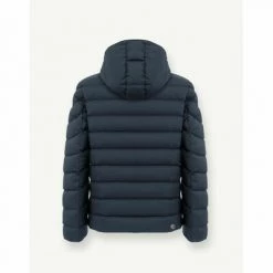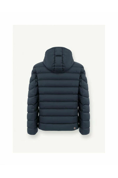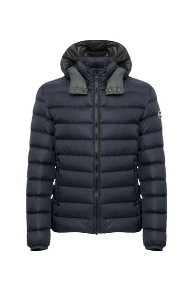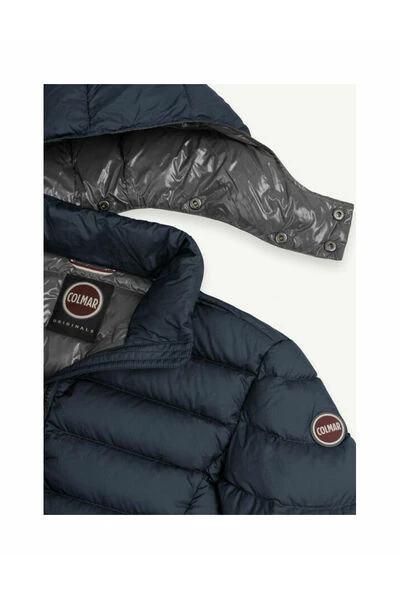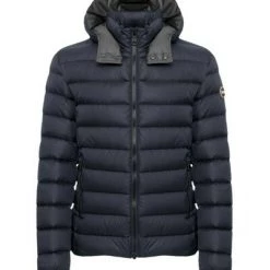 Navy Colmar sportief donsjack met afneembare capuchon. Gemaakt van halfglanzende stof met een zachte touch en gewatteerd met natuurlijk dons. Ritssluiting, zijzakken en binnenzak met ritssluiting. Afneembare capuchon met drukknoopsluiting. Waterafstotende behandeling.