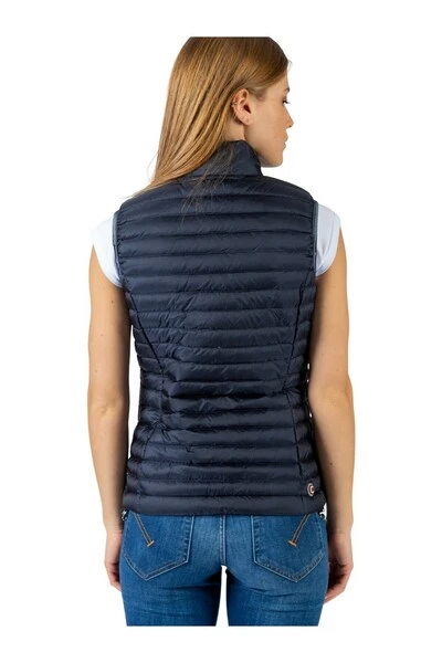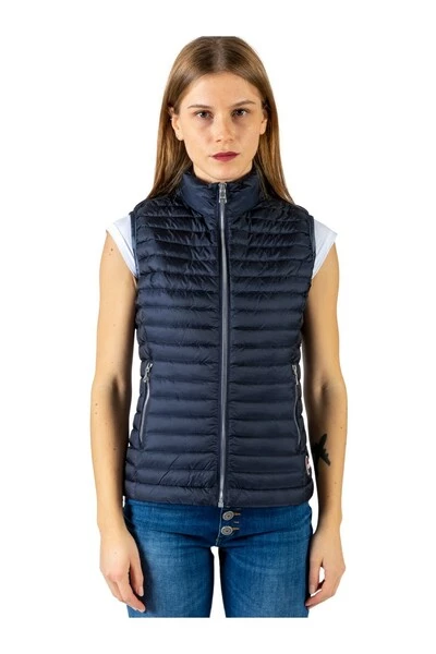 Lichtgewicht mouwloos donsjack in marineblauw zijde-hand nylon met fijne quilten. Silver Zip Sluiting. Stand-up kraag. Verticale zakken met zip. Armgaten in blauwe stretchstof. Aan de taille gemonteerd. Interne trekkoord aan de onderkant. Blauw nylon interieur.