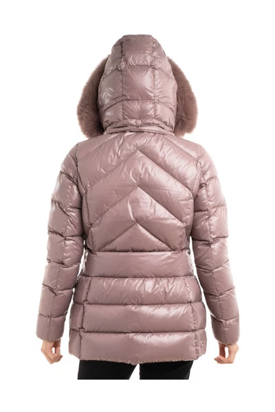 Gevoerde en gewatteerde nylon stof Hoog kraag verwijderbare afwijzers afneembare bont Detail lange mouwen met elastische manchetten Tweedwegen Zip Sluiting en Logo Zip Puller voorzakken met zip-logo-patch op de Logo-patch van de mouw op de achterkant