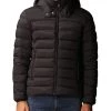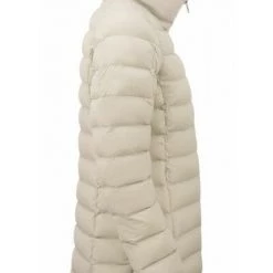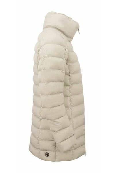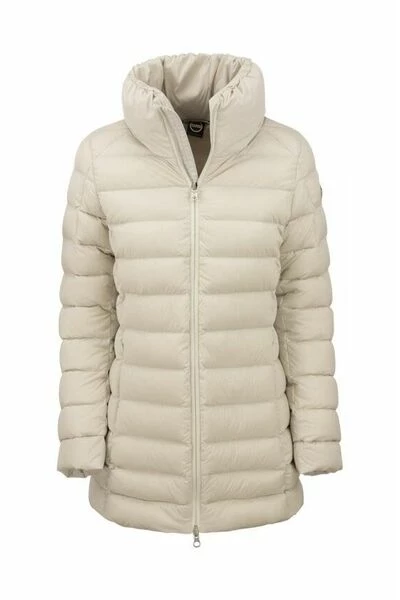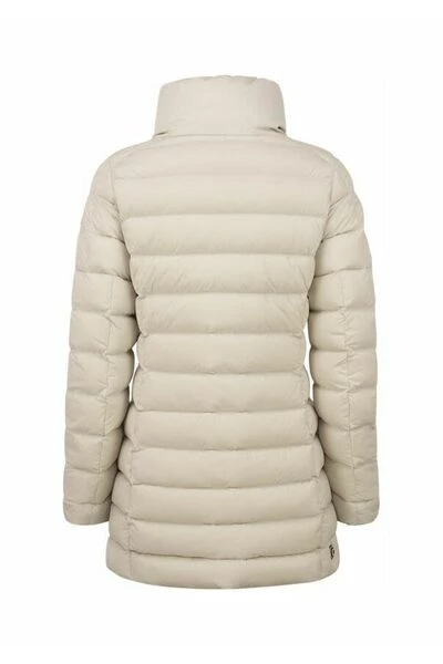 Women s lange jas gemaakt van waterafstotende stretchstof en opgevuld met natuurlijke down. Het lichte traag van de heupen, geholpen door het comfort van de stretchstof die zich aan het lichaam aanpast, maakt het model perfect voor elk silhouet en benadrukt de vrouwelijkheid ervan. De wrap-around kraag zal een uitstekende bondgenoot zijn bij het aanpakken van de winterkoude.- Zip Sluiting