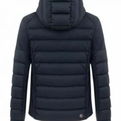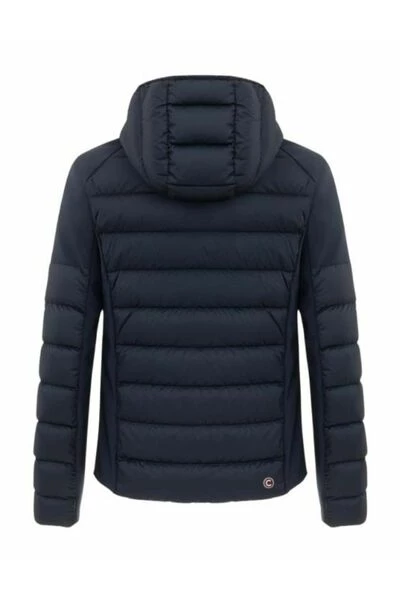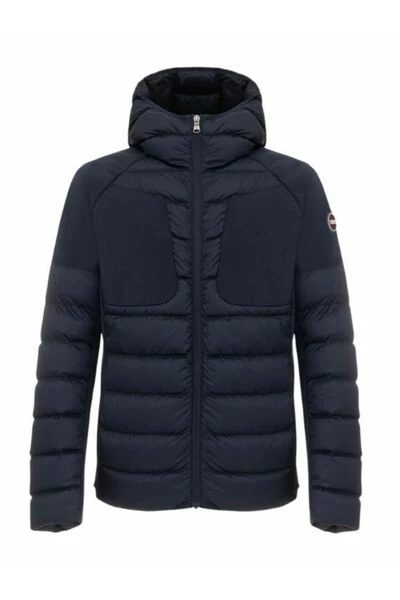 Colmar Originals Giacconi Navy-Chocolate Men`s Jacket met kap, gemaakt van ondoorzichtige polyesterweefsel met handvis met een gewatteerd lichaam en mouwen met uitzondering van zijkanten, longen en schouders gemaakt van SCUBA-effect stretchweefselweefsel, beide met waterafwillentbehandeling. Comfortabele zijzakken en praktische interne zak. Regelmatige en opgevulde pasvorm in natuurlijke veer.