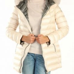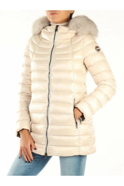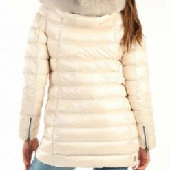 Gevoerde nylon stof en niet -verwijderbare nek met hoge capuchon gewatteerd met coulisse -details in afneembare vacht lange mouwen met sluiting met tweewegen ritssluiting voor de voorste zakken met zip patch -logo op het huls patch -logo op het achterpad: echte veerhoogte van het model ( cm): 175 Grootte veren: 40 Samenstelling: 100%polyamide
