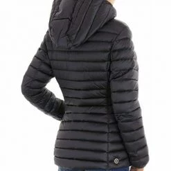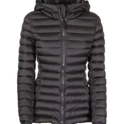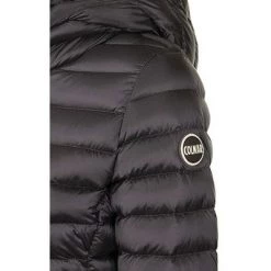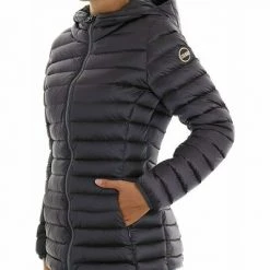 Halflang glanzend donsjack van Colmar. Donkergrijs jack met capuchon van waterafstotende behandeling met zwarte tweewegritssluiting, twee steekzakken met rits en logobatch op de linkermouw. Eén binnenzak. Elastische baleinen aan de mouwen en aan de onderkant van de jas.