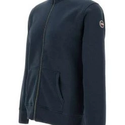 Colmar Originals Sweaters Colmar Menblend Cottonsweatshirt, marineblauw, geribbelde hoge kraag, ritssluiting, spleetzakken, geribbelde elastische manchetten en zoom, logo -patch op linkermouw, gewone pasvorm. Ideaal voor een casual look.