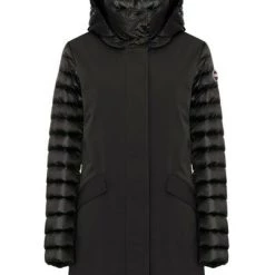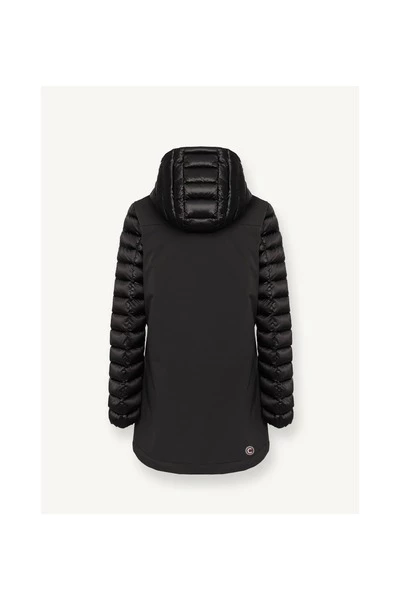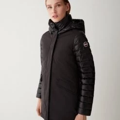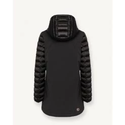 Middengerechte vrouwenjas met afneembare kap in drielaagse stretchstof, opgevuld met natuurlijke down. De afwisseling van gladde en gewatteerde onderdelen geeft gruis aan dit model met technische inhoud gemengd met charmante details. Sluiting met zip en perszakken met zip en pers met personderdelen afneembare motorkap natuurlijke veervulling stof ondoordringbaarheid: 10.000 mm waterkolom Water-repellente behandeling Colmar Originals Logo toegepast op de linkerkleef